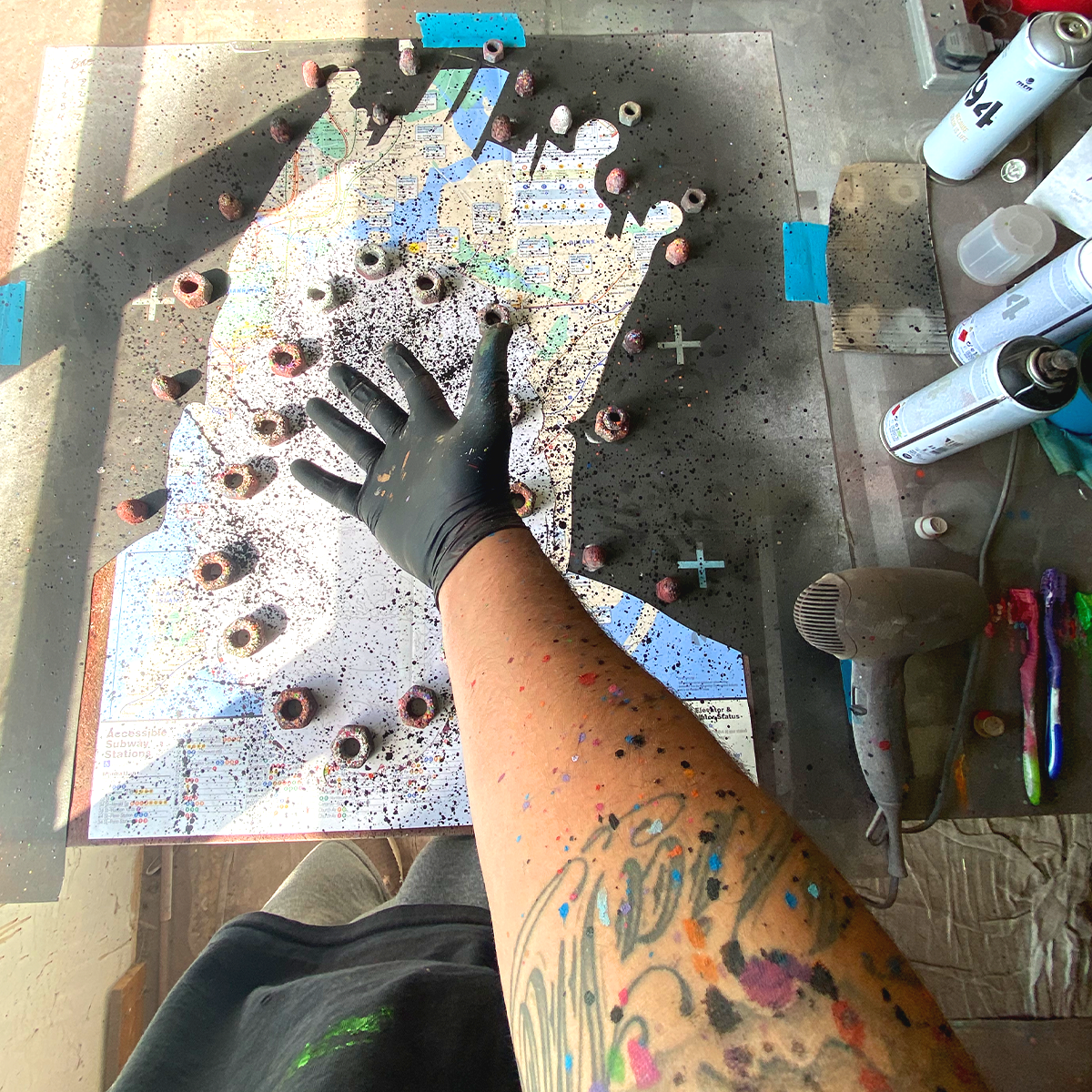 A perfect way to maintain the intricate detail of his illustrations, with crisp lines onto canvas without having to put the spray can down.